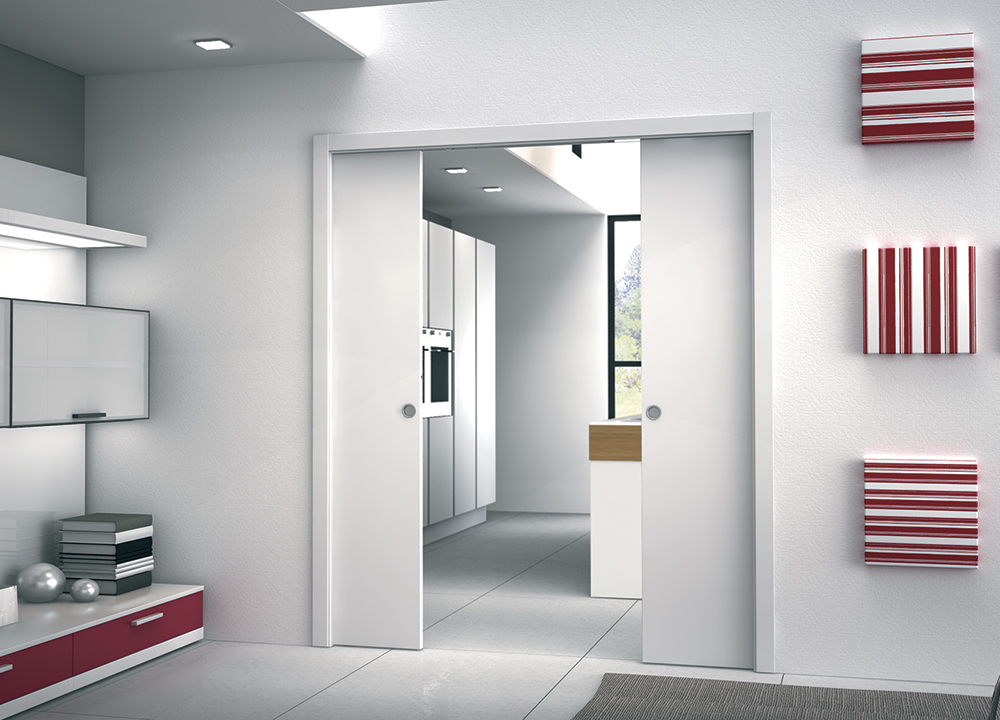 Большой просвет и максимальная адаптируемость. Двухстворчатая версия раздвижной двери дарит дому очень большие проходы и, в сочетании со стеклянными дверями, обеспечивает легкость и яркость.